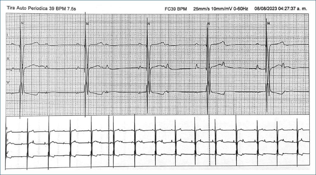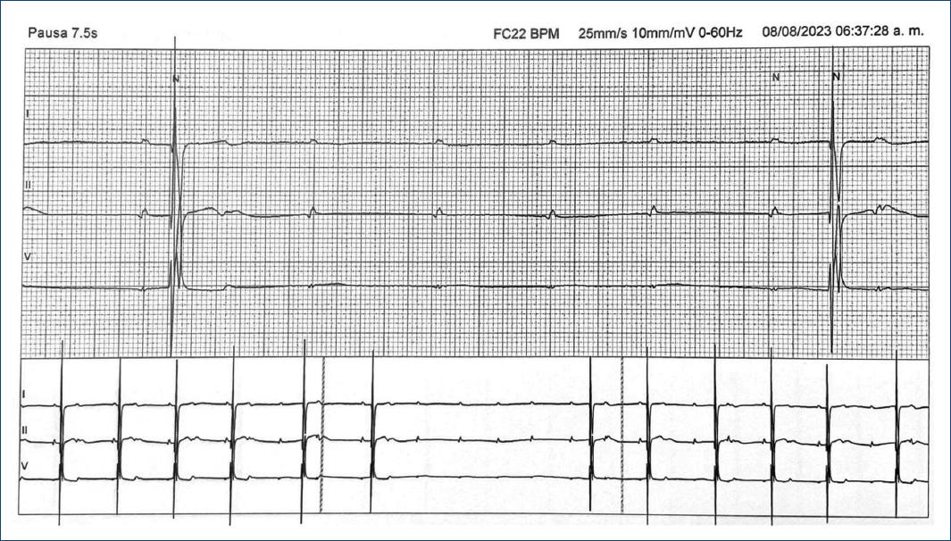 Figure 2 Monitoreo ambulatorio Holter donde se observa bloqueo auriculoventricular de alto grado con pausa ventricular de 7.5 s. En la tira de ritmo inferior se observa bloqueo auriculoventricular 2:1 que precede al bloqueo auriculoventricular de alto grado. En los primeros cuatro latidos pareciera observarse un PR constante en las despolarizaciones auriculares que preceden a las despolarizaciones ventriculares; en los dos latidos previos al bloqueo auriculoventricular de alto grado, comparativamente, pareciera observarse una prolongación del PR.