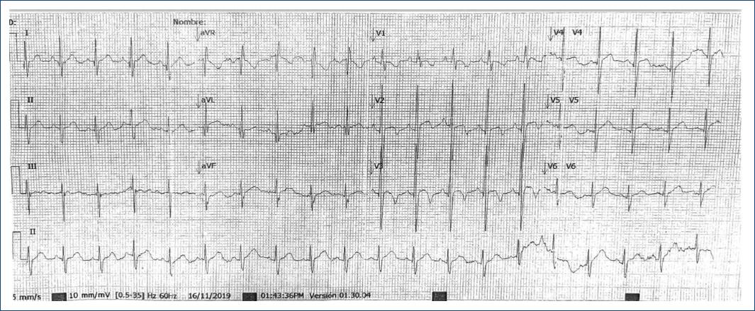 Figure 3 Electrocardiograma de 12 derivaciones prequirúrgico en el que se observa ritmo sinusal, PR de 120 ms, QTs no corregido 280 ms, eje a la izquierda, con presencia de bloqueo completo de rama derecha del haz de His y datos de crecimiento de cavidades derechas.