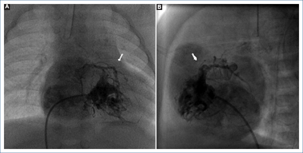 Figura 1 Ventriculografía derecha. Se observa atresia pulmonar con septum ventricular íntegro con conexiones ventrículo-coronarias, estenosis grave en el tercio proximal de la descendente anterior (flecha). A: proyección postero-anterior. B: proyección lateral izquierda.
