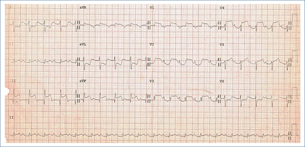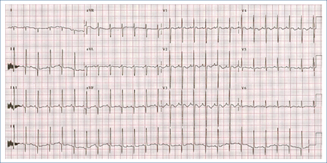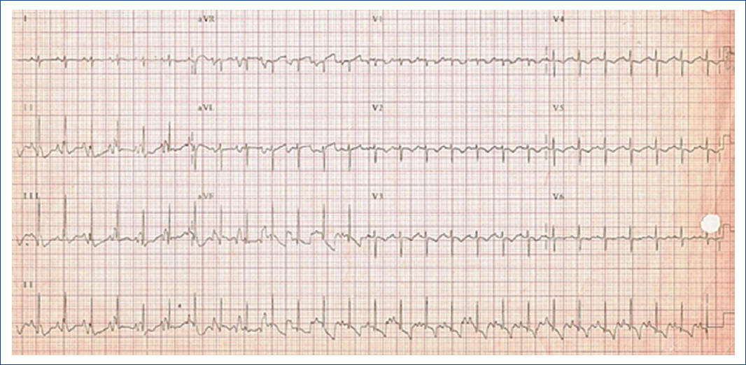 Figura 3 Electrocardiograma precateterismo: ritmo sinusal. FVM 160 lpm, ÂQRS +90°, onda P 0.5 mV, PR 120ms, QRS 40 ms, Qtc 332 Fridericia, crecimiento atrial derecho, ondas T negativas asimétricas en cara inferior, sin lesión ni infarto.