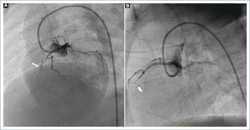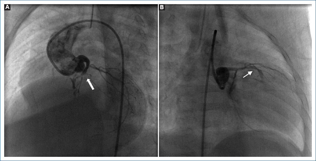 Figura 8 Coronariografía izquierda. A: proyección frontal: se observa el tronco coronario izquierdo con estenosis en su origen (flecha). B: proyección cuatro cámaras; flujo anterógrado de la circunfleja y atresia entre el tercio proximal y medio de la descendente anterior (flecha).
