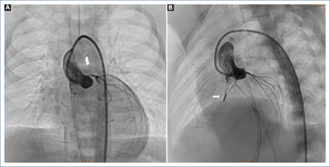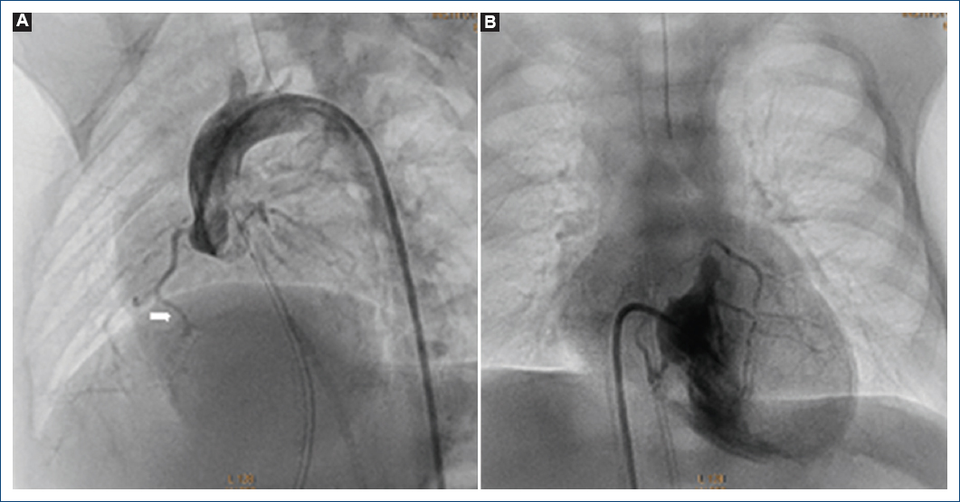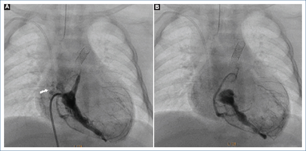 Figura 5 Ventriculografía derecha proyección postero-anterior. A: se observa atresia pulmonar con septum ventricular íntegro con conexiones ventrículo-coronarias con insuficiencia tricuspídea generada por el catéter angiográfico (flecha). B: al retirar el catéter angiográfico desparece la insuficiencia tricuspídea.