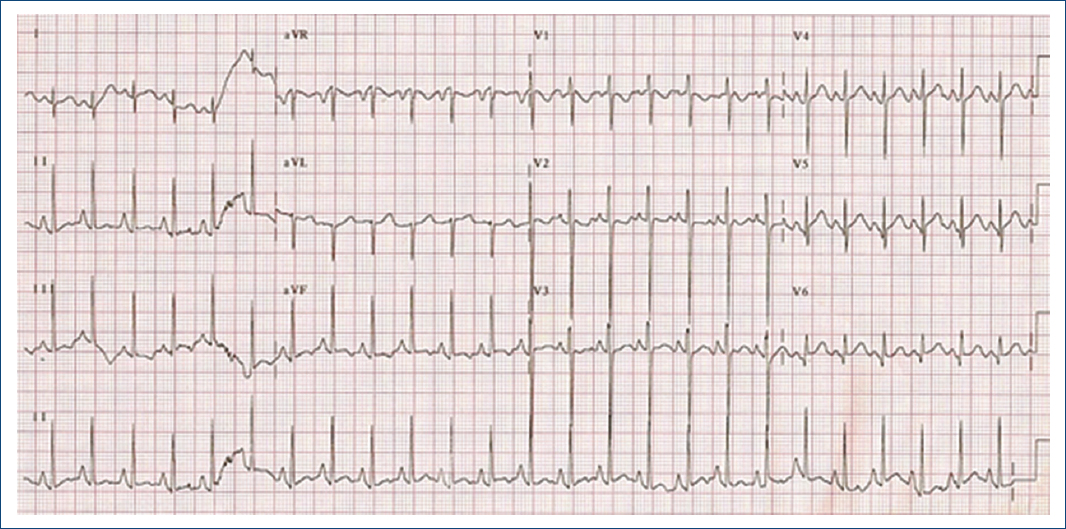 Figura 4 EKG 8 horas poscateterismo: ritmo sinusal, FVM 115 lpm, ÂQRS +160°, onda P 0.3 mV, PR 240 ms, QRS 80 ms, Qtc 345 Fridericia. Bloqueo auriculoventricular de primer grado, con supradesnivel del segmento S-T DIII, AVF, AVR, V1-V5. E infradesnivel en DI, AVL y V6 (infarto extenso de la porción antero-septal, lateral e inferior del ventrículo izquierdo).