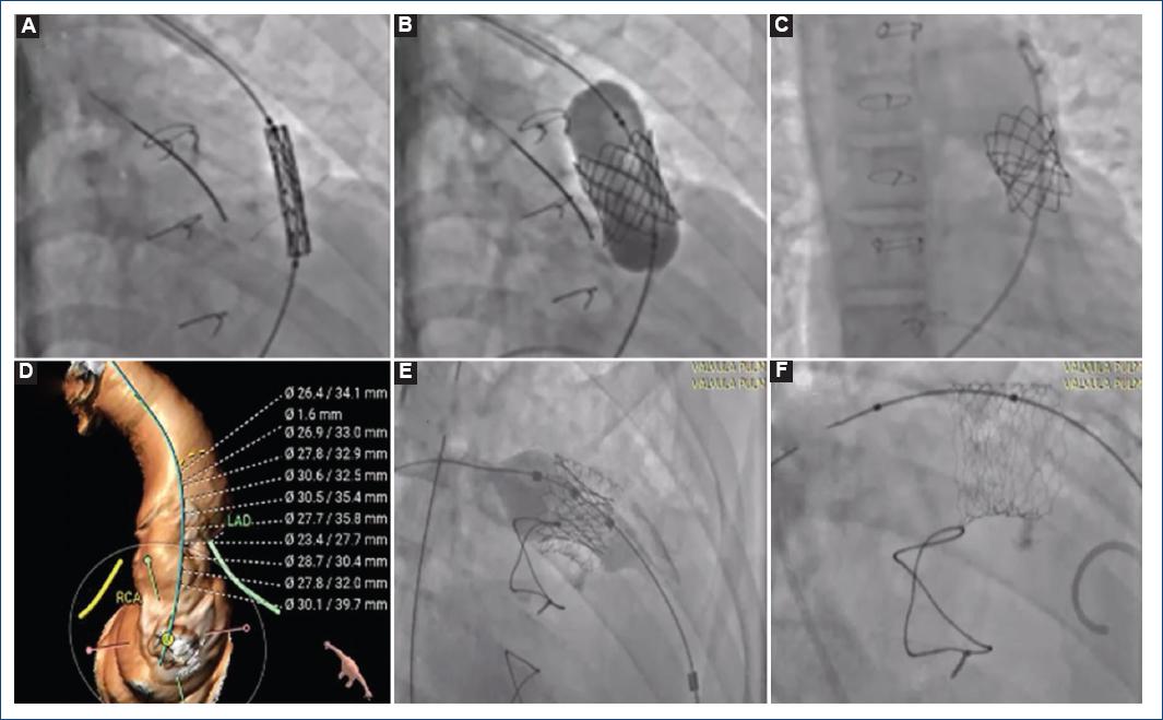Figura 1 Válvula Melody TPV 22 (PB1018) con Ensemble II 22 Fr implantada (válvula en válvula) en el caso 8. Descripción del procedimiento: se posiciona la válvula Melody a un tercio por debajo del plano de la válvula bioprotésica y el resto del stent por encima, se insufla el balón hasta 4 atm y se logra expandir de forma adecuada. La angiografía pulmonar en AP y LAO 90° confirma una válvula normofuncionante sin obstrucción. Presiones tras el implante: en la aorta 131/86/105 mmHg, en el ventrículo derecho 30/0/12 mmHg y en la arteria pulmonar 26/9/16 mmHg. A-C: angio TAC software 3-mensio (caso 10). D: Angio TAC software 3-mensio (caso 10). E y F: se implanta stent Andra® y luego válvula Myval No. 29 (caso 10).