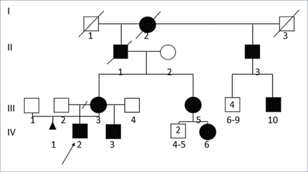 Figure 1 Genealogy of the studied family. The arrow points to the purpose (IV: 2), his mother (III: 3), and maternal half-brother (IV: 3) presented the CACNA1S gene variant c.2700G > A (p.Arg900Ser). An autosomal dominant inheritance pattern is demonstrated in the presence of male-male transmission (II:3 and III:10
