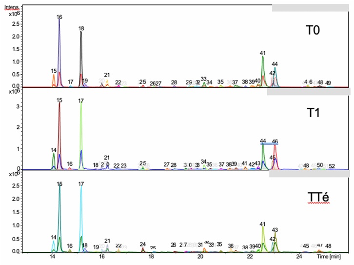 De acuerdo con los porcentajes relativos de cada compuesto, respecto al total de compuestos eluidos, los capsaicinoides capsaicina y dihidrocapsaicina son los de mayor abundancia, seguido por nordihidrocapsaicina, homocapsaicina y homodihidrocapsaicina. Con respecto a los tratamientos la única diferencia importante se observa en la baja concentración de homocapsaicina en T0, con Tr de 15.3 min. En la Figura 1 se ilustran los perfiles cromatográficos de los extractos, se tienen señales de 42 a 50 compuestos en las muestras. Otros compuestos abundantes de acuerdo con los valores de intensidad y área en los cromatogramas son en el tiempo de elución de 22.7 min, que no fue posible identificar, y el compuesto a 22.8 min, con [m/z]+ de 270.2831, que puede corresponder al flavonoide apigenina, ya que este compuesto se ha reportado en extractos de chile (Antonio et al., 2018; Hernández-Pérez et al., 2020; Zamljen et al., 2022).