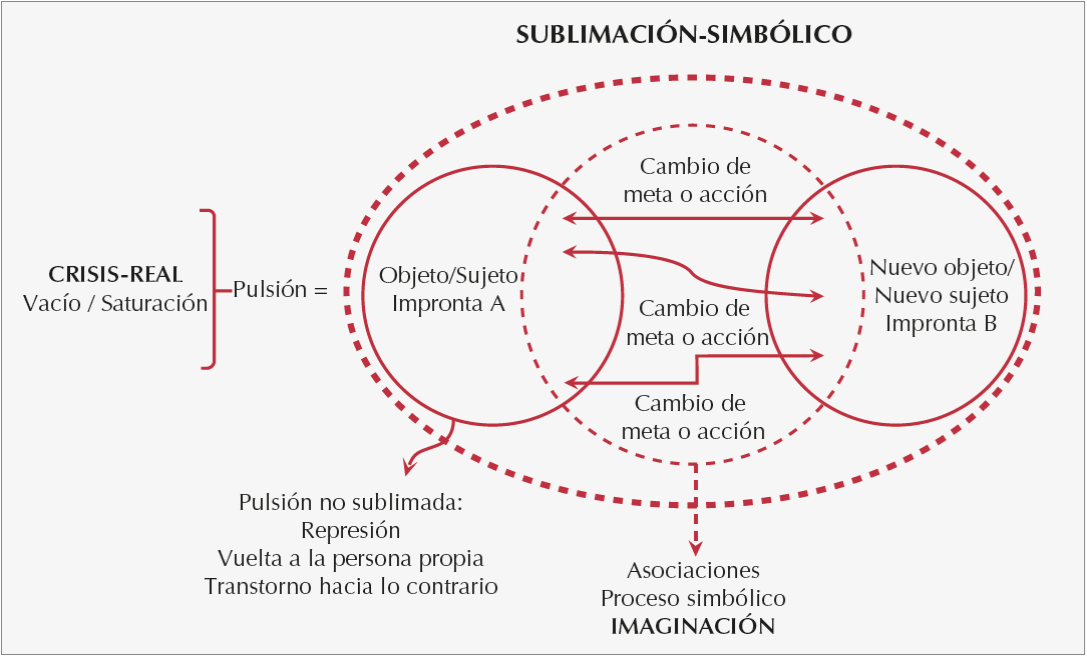 Como se puede observar en la Imagen, tanto en la teoría como en la práctica del Taller de Creatividad la pulsión aparece a partir de una crisis o un real, como fuerza o tensión, en búsqueda de la realización de un deseo que demanda su satisfacción. Si la pulsión se estanca el objeto-sujeto puede fijarse en la impronta A -situación de la vuelta hacia la persona propia y la represión o en el trastorno hacia lo contrario por acción del desplazamiento de la meta que va y viene-. La meta puede o no buscar resolverse entre ambas improntas pero si no hay cambio de meta, es decir, si se inhibe la acción, implica que la pulsión no ha sido sublimada y queda bloqueada, atrapada en sus destinos: la vuelta a la persona propia, el trastorno hacia lo contrario o la represión. Para realizar la sublimación o proceso simbólico es necesario que la pulsión provoque el cambio de la meta, es decir, el cambio de acción, la cual como resultado de sus desplazamientos promueve en el objeto-sujeto un cambio de posición, haciendo aparecer un objeto-sujeto, un objeto artístico y se sitúa en otro lugar, sublimado, simbolizado. Una vez que el sujeto encuentra el nuevo posicionamiento -impronta B- ha realizado la experiencia artística, ha traspasado los bloqueos que le impedían la expresión del sí mismo, de esta manera aparecen la recuperación creativa y la corporeización estética.