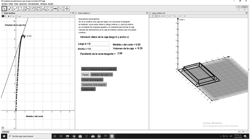 A continuación, se ilustran las instrucciones de la hoja de trabajo (Tabla 1) del problema de optimización de la caja sin tapa, así como los objetivos específicos y los registros de representación involucrados, con la siguiente simbología: lenguaje natural (LN), algebraico (A), numérico (N) y gráfico (G). Una vista de la aplicación en GeoGebra para este problema se ilustra en la Figura 1.