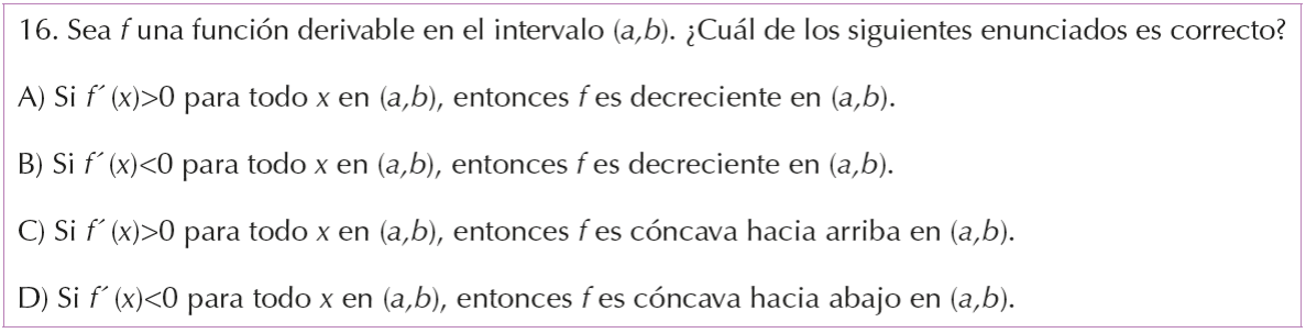 En el reactivo 16 se presentan enunciados en donde se solicita al estudiante elegir aquel que sea correcto (Figura 3), el estudiante debe asociar el signo negativo de la primera derivada con la función decreciente, el 62 % respondió de forma correcta, 18 % asoció de manera incorrecta el signo positivo de la primera derivada con la concavidad hacia arriba de la función, 13 % asoció de forma incorrecta el signo positivo de la primera derivada con la función decreciente, el resto vinculó de manera incorrecta el signo negativo de la primera derivada con la concavidad hacia abajo de la función en un intervalo dado.