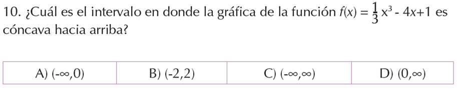 | 5 | 10 | Determinar el intervalo donde la función es cóncava hacia arriba a partir de su representación algebraica. | 16 % | 5 % | 1 % | 77 % | A - A | T |