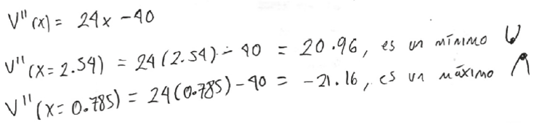 | 7. Determina V´(x), iguala a cero dicha función y calcula el valor o los valores de con los que se obtienen los puntos críticos (criterio de la primera derivada). | Utilizar el criterio de la prime ra derivada para determinar el máximo relativo. Calcular la derivada de la función de vo lumen y el máximo relativo. | A - N N - G |