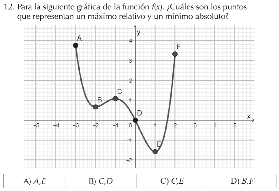 En el reactivo 12 se solicita identificar en un gráfico dado (Figura 6) un máximo relativo y un mínimo absoluto, el 78 % de los estudiantes contestó correctamente, sin embargo, el 21 % confundió el máximo absoluto con un máximo relativo aunque acertó con el mínimo absoluto, el resto localizó correctamente el máximo relativo y confundió un punto de inflexión con el mínimo absoluto.