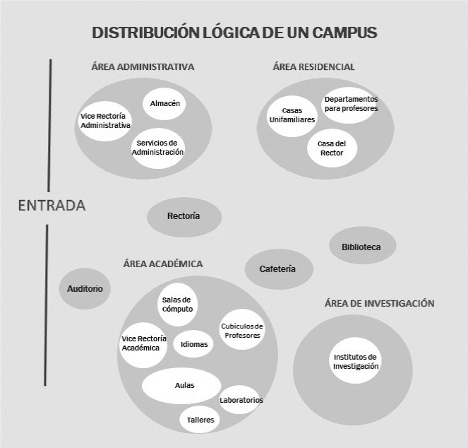 De esta forma, puede comprenderse que, para esta investigación, los valores estéticos son referidos como los que permiten al estudiante sentir y comunicar -o no- armonía y equilibrio anímico, sustantivos para el logro de la tarea educativa, retratada en cada perfil de egreso. La universidad en la búsqueda de la consecución de valores estéticos positivos ilustra la distribución deseable de todo el espacio universitario (véase la Figura 2), la cual es la pauta central para el desarrollo arquitectónico en los campus. En tanto que no se cuenta en la actualidad con un diseño adicional de arquitectura de paisaje.