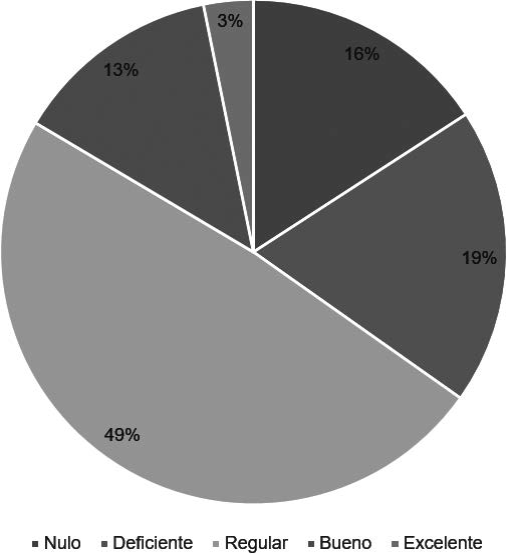 Para finalizar esta sección del cuestionario se preguntó sobre la percepción de su aprendizaje en la modalidad en línea, a lo que 41.85 % de alumnos respondió que lo considera deficiente; 13.3 % tiene una percepción positiva sobre este aspecto ya que considera que su aprendizaje ha sido bueno y solo 1.9 % lo considera como excelente. La media es de 2.69; es decir, se encuentra entre deficiente y regular, considerándose de manera general como una percepción negativa.
