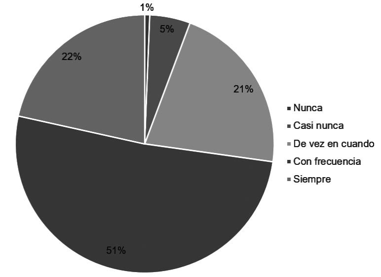 En cuanto al uso de plataformas para tomar clases virtuales, también se observó un cambio relevante, 97.5 % de los alumnos mencionó que utilizan Zoom, 72.2 % WhatsApp y 29.1 % Google Meet. En tanto que la continuidad con la que toman clases virtuales es alta ya que, más de 70 % expresó que estas se dan con frecuencia (51.3 %) o (21.5 %) siempre (véase la Figura 2).