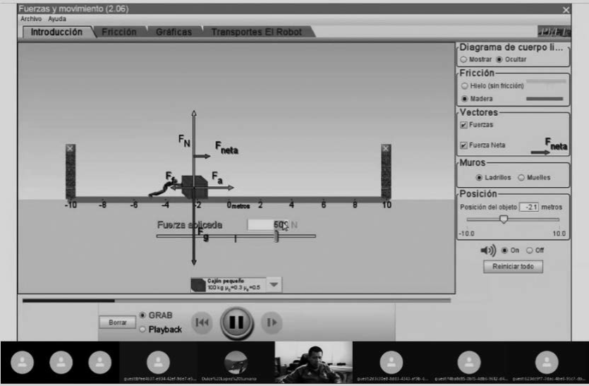 Las clases virtuales para la instrucción de las leyes de Newton apoyada por simuladores consistieron de cinco sesiones de una hora durante las cuales el docente hizo uso de las simulaciones PhET “Fuerza y Movimiento” y “Rampa: Fuerzas y movimiento” como herramienta de apoyo para ilustrar los contenidos y realizar experimentos virtuales relacionados con las leyes de Newton por parte de los estudiantes. En la Figura 1 se muestra una imagen de la instrucción en línea apoyada con simuladores.