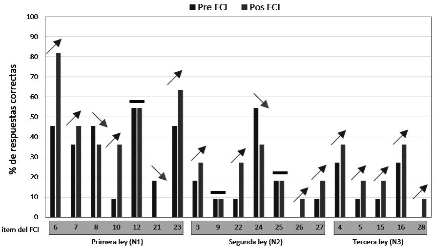 En este estudio se hizo uso de la prueba denominada Force Concept Inventory (FCI), que es un Cuestionario Sobre el Concepto de Fuerza formulado por Hestenes, Wells y Swackhamer (1992), el cual es uno de los instrumentos más utilizados para evaluar el aprendizaje conceptual en cursos introductorios a la Física (Fazio y Battaglia, 2019). En este trabajo se empleó la versión en español de la prueba FCI revisada en 1995, que se encuentra disponible a través del portal web www.physport.org. En el análisis de los datos se consideró la identificación realizada por Caballero et al. (2012) que relaciona las leyes de Newton con 19 de las 30 preguntas del FCI, categorizando éstas en tres subconjuntos de 7, 7 y 5 preguntas, etiquetados en este estudio como N1={6,7,8,10,12,21,23}, N2={3,9,22,24,25,26,27} y N3={4,5,15,16,28}, que corresponden a la primera, segunda y tercera ley de Newton, respectivamente.