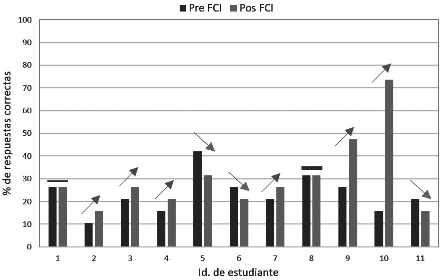 En relación con el desempeño de cada estudiante, en la Figura 3 se observa una tendencia grupal favorable, siendo sólo tres los estudiantes que mostraron una tendencia negativa después de la intervención, lo cual complementa la observación realizada a nivel de ítem.