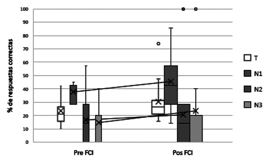 Sobre las preguntas como conjunto, el puntaje promedio (valor medio) pasó de 4.5/19 (0.23) a 5.8/19 (0.30), con desviaciones estándar de 1.6 y 3.2. En la Figura 4 son mostrados, a través de sus respectivos cuartiles, el promedio total de respuestas correctas (T) y, por subconjunto, de preguntas. Acerca del conjunto T, se observa un valor medio más alto, con extremos superiores e inferiores que señalan una variabilidad equiparable entre los datos.