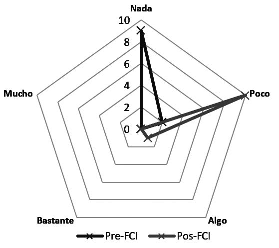 En lo que respecta a la percepción de los estudiantes sobre su conocimiento, en el caso de la pregunta 1 (antes de la instrucción), el 82 % (9/11) de los estudiantes estimaron saber “nada” sobre el tema mientras que un 18 % (2/11) consideró conocer “poco”. En cuanto a la pregunta 2 (después de la instrucción), el 91 % (10/11) señaló saber “poco” y un 9 % “algo” (1/11). En la Figura 5 se puede observar una mejora grupal en la percepción de los estudiantes, lo que apoya los resultados de la prueba FCI.