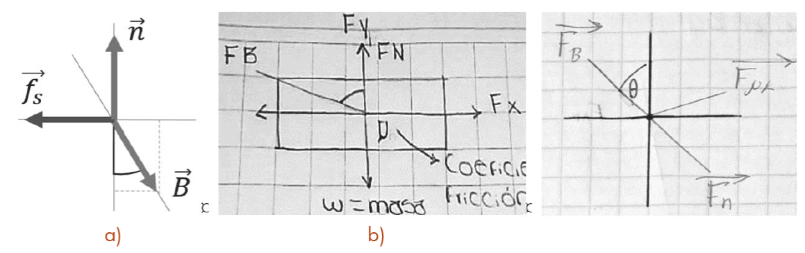 En la Figura 6 se muestra la respuesta esperada (a) y la respuesta obtenida por dos de los estudiantes (b). Como se observa, los diagramas generados describen de manera parcial la interacción entre las fuerzas que actúan sobre el bloque, denotando un vacío argumental sobre la aplicación de la tercera ley de Newton, lo que concuerda con los resultados mostrados en la Figura 2, subrayando la necesidad de contar con herramientas para el apoyo en la enseñanza de este tópico particular.
