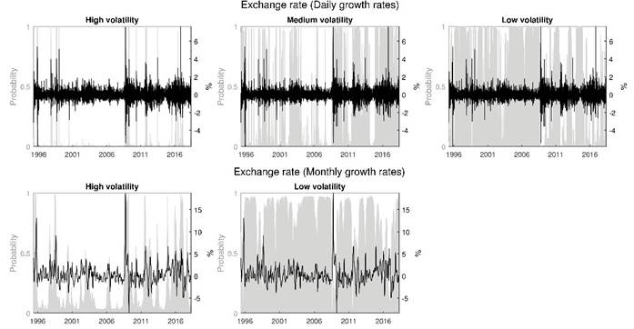 The model specification in monthly data based on the Bayes factor criteria, coincides with Islas-Camargo et al. (2017) supporting a MS specification over the linear autoregressive model, who studied the efficiency in the forward exchange rate. However, in high frequency exchange rate (Peso/Dollar) data, the MS specification suggests three states instead of two. In that paper, it is argued that the likelihood ratio test leads to a MS framework with two states, but this test is not valid as it was mentioned before. Therefore, the number of states might be misspecified. Even though the sample of that work covered 2002 to the beginning of 2017, a three states model was supported by the data according with our results and Figure 2.