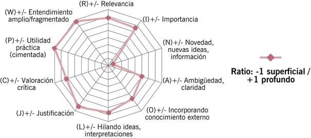 Una vez que las transcripciones son marcadas, los totales de los indicadores (+) positivos y (-) negativos son contados y se calcula el ratio de cada indicador a través de la siguiente fórmula: x ratio = (x+ - x-)/(x+ + x-); los totales son convertidos en una escala de -1 = sin valor crítico con superficialidad a +1 = crítico con profundidad.