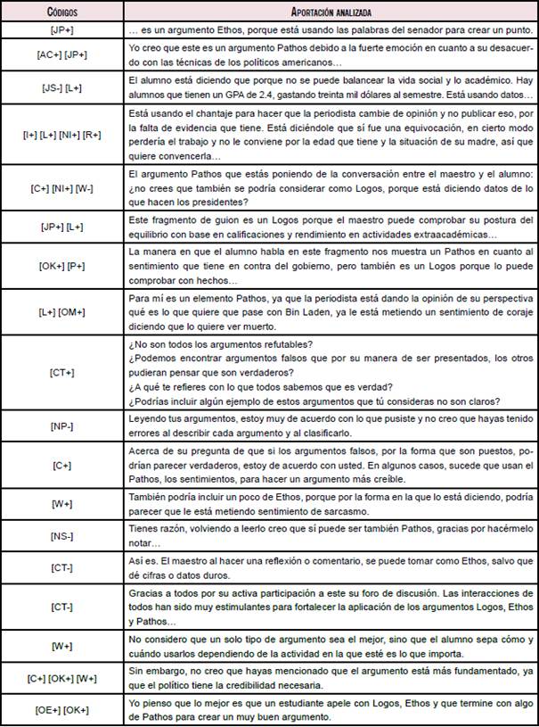 Fuente: JP (+) prevé evidencias y ejemplos; AC (+) clarificar enunciados ambiguos; JS (-) ofrece varias soluciones sin especificar cuál es la más adecuada; L (+) generando nuevos datos de información recabada; I(+) puntos o eventos importantes; NI (+) nuevas ideas para discutir; R(+) enunciados relevantes; C(+) evaluación crítica de propia contribución o de otros; W(+) discusión amplia (problema con una perspectiva amplia, incluye estrategias de intervención con un marco teorético); W(-) discusión puntual (incluye partes o fragmentos de situación, sugerencias parciales sin intervención sólida); OK (+) evidencia de usar conocimiento previo; P(+) relaciona posibles soluciones a situaciones familiares; OM (+) utilizar material externo relevante; CT (+) tutor promueve la evaluación crítica; CT(-) tutor acepta interacciones sin crítica; NP(-) repitiendo lo que ya se ha dicho; NS (-) aceptando la primera solución ya ofrecida; y OE (+) partiendo de experiencias personales. Extractos de aportaciones obtenidas de las transcripciones de los 21 foros de discusión realizados en el curso. Los tres foros contienen 1 254 aportaciones.