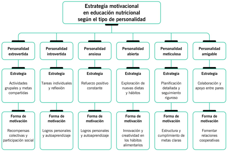 Este análisis teórico durante la consulta presencial permitió sentar las bases del diseño de la aplicación NutriSmarTR y la estrategia educativa, centrándose en la motivación de los participantes y su iniciativa de modificar su comportamiento. La figura 1 expone las diferentes estrategias motivacionales según la personalidad de cada individuo para implementar la educación nutricional.