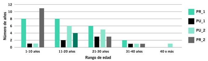 La edad de los profesores se encuentra en el rango de los 25 a los 78 años, con un promedio de 47.32 años. El PR_2 tiene a los profesores más jóvenes, con una edad promedio de 41.21 años, seguido del PR_1 con un promedio de 44.95 años, PU_1 con 52.28 años y PU_2 con 57.21 años.