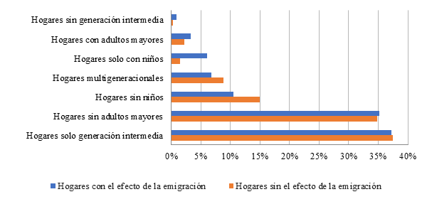 La figura 4 presenta las categorías utilizadas para analizar la composición generacional de los hogares, por su parte la gráfica 10 muestra la distribución de los hogares sin y con el efecto de la emigración, permitiendo evidenciar los cambios en la convivencia intergeneracional como resultado de la movilidad internacional.