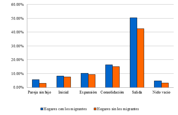 A partir de esta clasificación, la gráfica 11 presenta la distribución de los hogares antes y después de la emigración, permitiendo identificar cómo la movilidad internacional impacta las distintas etapas del ciclo de vida familiar. Esta comparación evidencia los cambios en la estructura y composición de los hogares, destacando las transiciones más afectadas por la emigración.