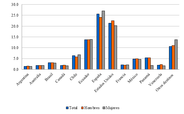En el ámbito internacional, los cuatro principales destinos para los colombianos en el período de estudio fueron España (25.7 %), Estados Unidos (21.3 %), Ecuador (13.8 %) y Chile (6.3 %) (gráfica 6). Se observan diferencias importantes por sexo: mientras que España tiene mayor peso para las mujeres, posiblemente debido a la demanda en sectores de cuidado y servicio doméstico, Estados Unidos presenta mayor representación masculina, lo que podría estar vinculado a la inserción en sectores como la construcción y el transporte. Francia también aparece como un destino destacado, lo que podría estar asociado a la migración estudiantil y profesional calificada. La relevancia de Ecuador y Chile resalta la importancia de la migración intrarregional, mientras que la categoría “otros destinos” sugiere que la migración colombiana continúa diversificándose, explorando nuevos mercados laborales y oportunidades de movilidad internacional más allá de los destinos tradicionales.