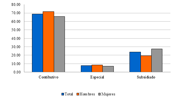 La gráfica 7 muestra que 88 por ciento de los emigrantes colombianos estaba afiliado al sistema de salud antes de migrar, lo que indica que la migración no estaba relacionada con la falta de cobertura en salud. La mayoría pertenecía al régimen contributivo5 (69 %), lo que sugiere que contaban con empleo formal o ingresos suficientes para aportar a la seguridad social. En contraste, 24 por ciento estaba en el régimen subsidiado, lo que permite suponer que, aunque una parte de la población migrante no se encontraba en condiciones de pobreza extrema, sí existían perfiles migratorios con mayor vulnerabilidad económica. Se observan diferencias por género, con una mayor presencia de hombres en el régimen contributivo y más mujeres en el régimen subsidiado, lo que puede estar relacionado con la brecha de acceso al empleo formal antes de emigrar. Finalmente, solo 8 por ciento de los emigrantes estaba afiliado a regímenes especiales, lo que indica que la migración no es predominante entre sectores con estabilidad laboral, como fuerzas militares o entidades estatales.