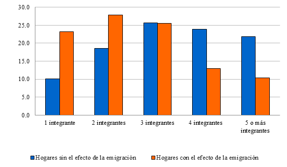Los resultados muestran que la emigración genera un impacto en la estructura de los hogares de origen, en cuanto se observa una disminución del tamaño promedio de los hogares tras la emigración, pasando de 3.5 a 2.9 personas por hogar.