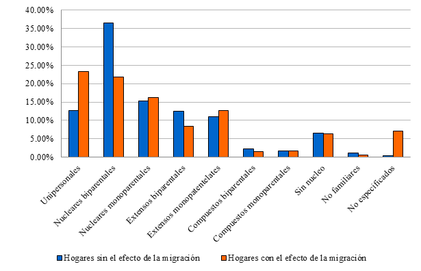Gráfica 9 Distribución de hogares sin y con el efecto de la emigración, según tipología desagregada de estructura familiar