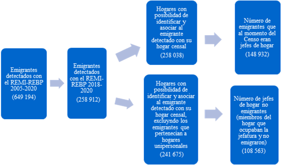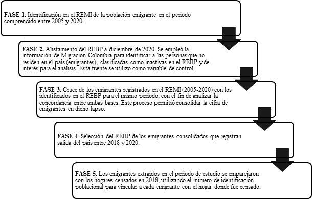 El proceso metodológico consistió en la integración de tres fuentes de información: el REMI, el REBP y el CNPV 2018. De este modo se identificaron emigrantes en el REMI, se logró vincularlos con su información en el REBP y, finalmente, se les asoció con su hogar censal en el CNPV 2018. Este procedimiento se desarrolló en varias fases, como se muestra en la figura 1.