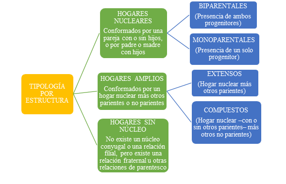 La clasificación de los hogares parte de una distinción fundamental entre hogares familiares y no familiares. Los hogares familiares están conformados por individuos que comparten lazos de consanguinidad, afinidad o vínculos legalmente reconocidos, y su estructura se organiza en torno a un núcleo conyugal, filial o una relación de parentesco cercana con la persona identificada como jefe/a del hogar. Desde una perspectiva estadística, la variable parentesco es clave para tipificar los hogares y analizar sus dinámicas en distintos contextos sociodemográficos.