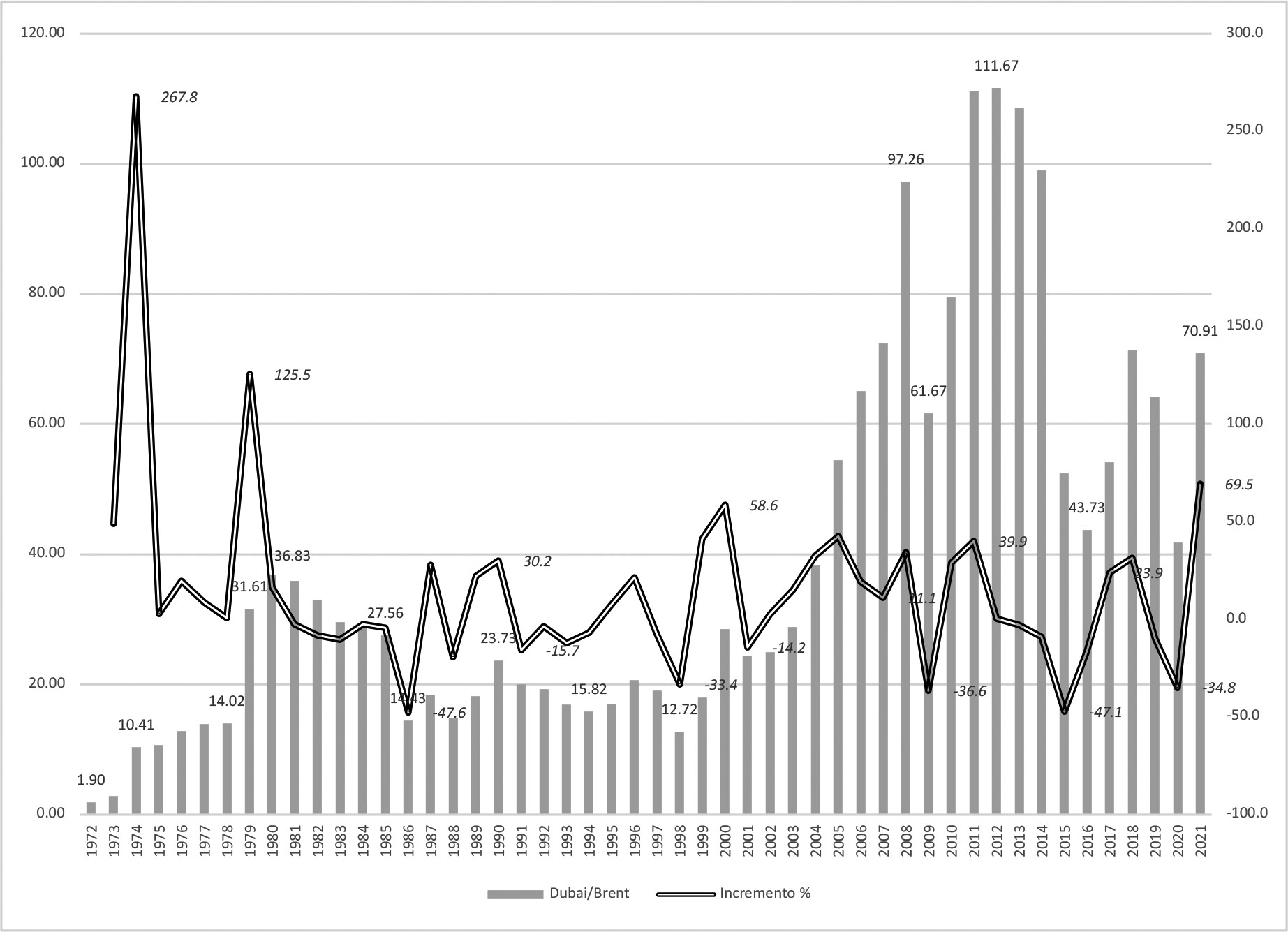 En materia de reacción del mercado petrolero ante los cambios geopolíticos en territorio de los países productores, lo que muestran los conflictos de Yom Kipur, de la revolución de Irán, de Irán vs. Irak y de Irak vs. Kuwait es que, después de que los precios suben de manera descontrolada, también tienden a bajar, aunque de forma mucho más espaciada en el tiempo; además, ya no vuelven al piso que tenían antes del incremento, al menos en términos nominales. Otra observación importante es que el precio tiene cierta ciclicidad: los niveles más bajos han coincidido alrededor de los años terminados en 8, 9 y 0: 1978, 1988, 1998, 2009, 2020. De la misma manera, los más altos han coincidido con terminaciones en 0, 1 y 2: 1980, 1990, 2000, 2012 y 2022 (no está incluido en la gráfica 1 este último año, cuando se llegó a un precio promedio del crudo Brent de 100.78 D/B).