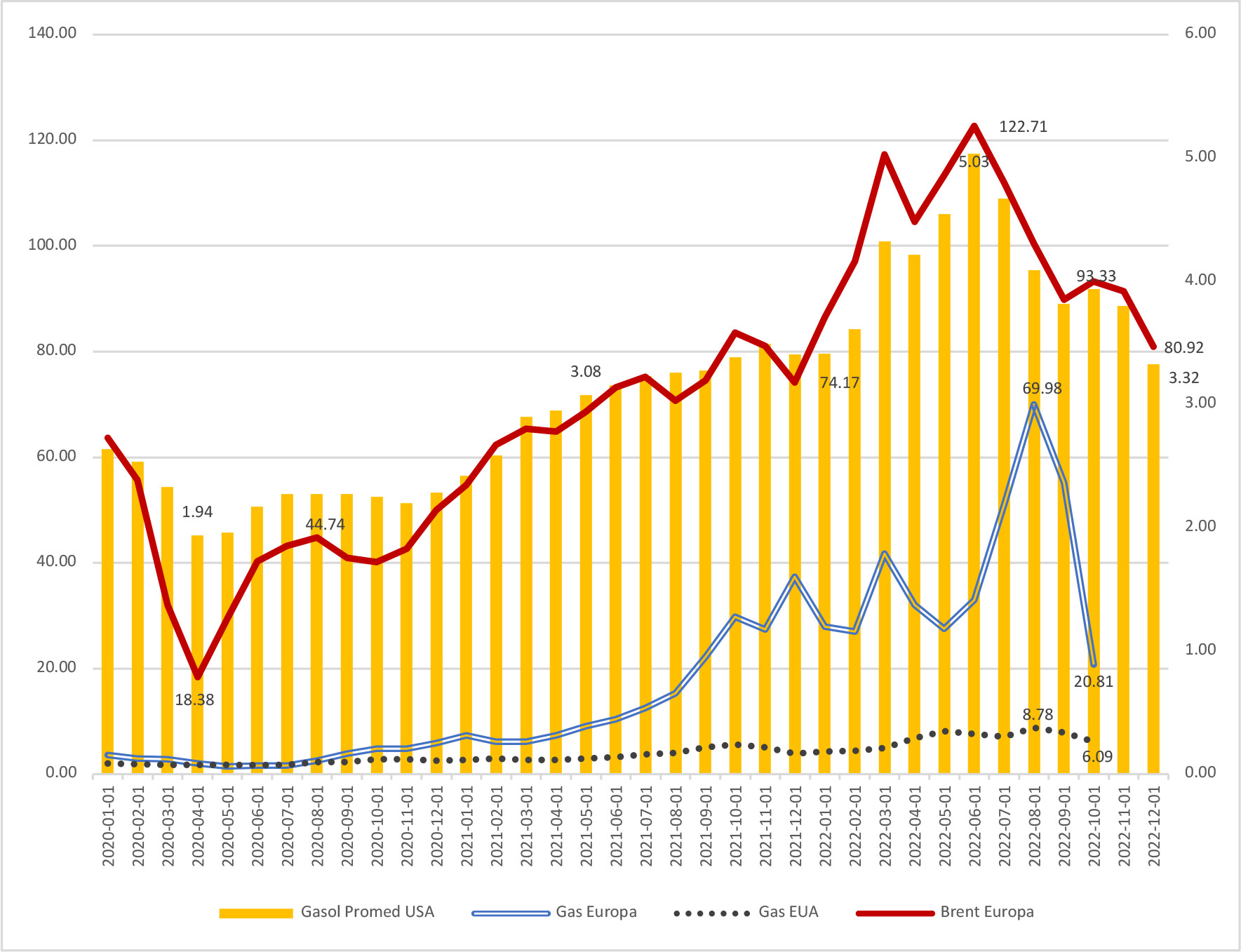 Nota: el precio del Brent crudo al que se refiere la mayor parte de la gráfica se situó al cierre de 2022 en un promedio de 100.78 dólares por barril, 42 por ciento más alto que el observado en 2021.