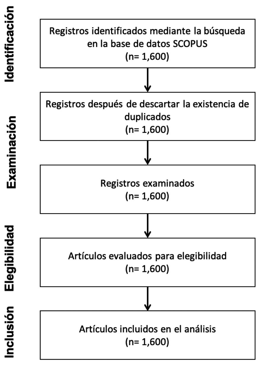 El estudio se realizó con información de Scopus (Elsevier, 2022). La búsqueda y la selección de la información se llevó a cabo en dos fases. En la primera, se introdujo el término de búsqueda “social entrepreneur”, entre comillas. Si se toma en cuenta que el objetivo de la búsqueda fue obtener resultados aproximados a la frase planteada, el uso de comillas es indispensable dada la naturaleza del buscador. La búsqueda se limitó a título, resumen y palabras clave. Los artículos publicados en 2022 fueron excluidos para demarcar el análisis a años calendario completos. La búsqueda de literatura se realizó el 11 de marzo de 2022; de ésta se obtuvieron 1 600 documentos.