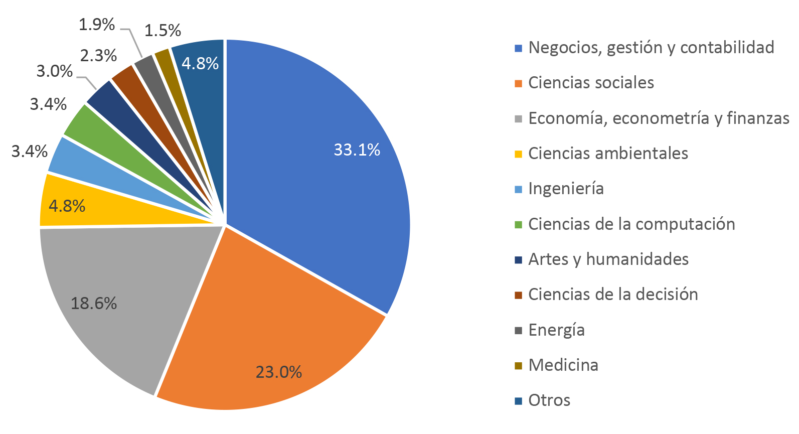 El emprendimiento social y el emprendedor social se han estudiado de forma multidisciplinaria. Como se puede ver en la gráfica 2, la mayoría de los escritos giran en torno a tópicos de negocios, gestión y contabilidad (33.1 por ciento), ciencias sociales (23 por ciento), así como economía, econometría y finanzas (18.6 por ciento). No obstante, el fenómeno del emprendimiento social también se ha estudiado desde el enfoque de las ciencias ambientales, ingeniería, ciencias de la computación, artes y humanidades, ciencias de la decisión, energía, medicina, entre otras.