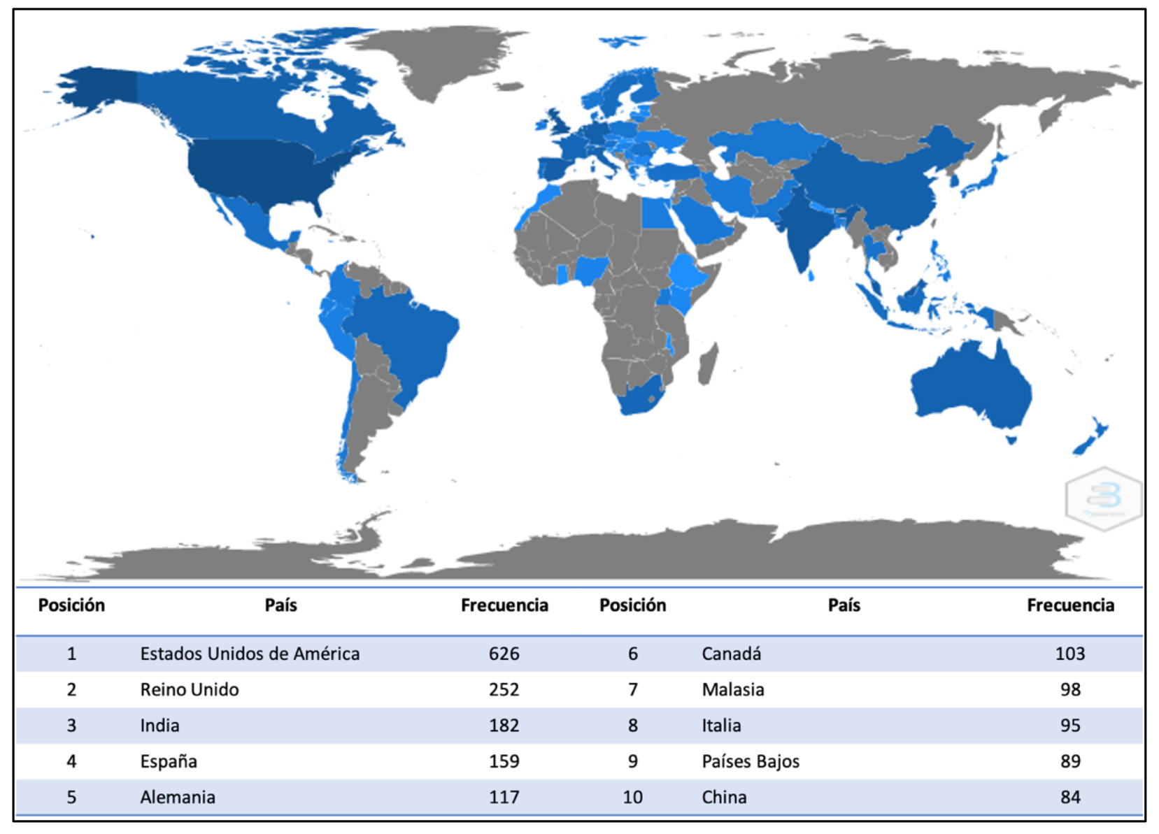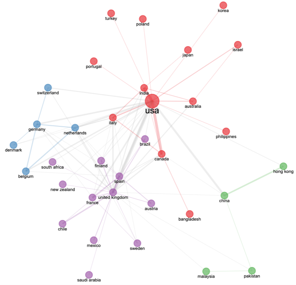 La red tiene los nodos más importantes en Estados Unidos (intermediación = 290.24), Reino Unido (intermediación = 171.10), Países Bajos (intermediación = 5.51) y China (intermediación = 6.08); así configuran cuatro clústeres, entre los que destaca el encabezado por Estados Unidos, señalado en color rojo, que cuenta con 13 nodos de red.
