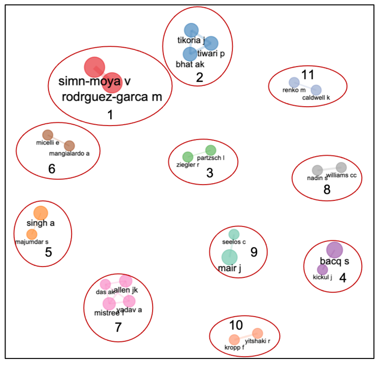 En el diagrama 3, el clúster 1, en color rojo, es el que más destaca; éste se compone por Rodríguez-García y Simón-Moya, de quienes se tiene un registro de 10 colaboraciones en diversas publicaciones. El clúster 2 está formado por Tiwari, Bhat y Tokoria, con un total de cinco colaboraciones.