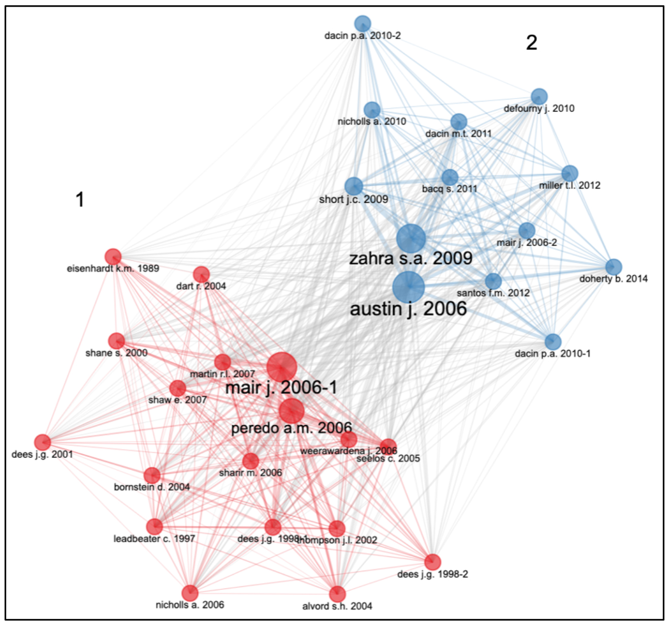 Acerca del análisis de cocitación, se encontró que las investigaciones se pueden ubicar en dos clústeres: uno conceptual y uno teórico. En el primero de ellos se agrupan principalmente trabajos abocados a discutir el concepto de emprendimiento social y sus implicaciones académicas y como área de estudio. En el clúster teórico se hallan artículos que buscan llevar adelante una teoría del emprendimiento social vinculando preceptos de la teoría económica y administrativa del emprendimiento comercial.
