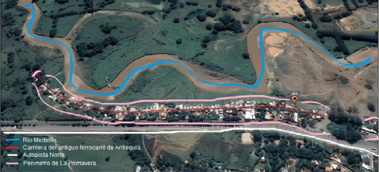 El poblamiento de La Primavera data de 1969 en lo que parecía ser un territorio abandonado en los alrededores del antiguo Ferrocarril de Antioquia que funcionó hasta 1961. A partir de un proceso de loteo, se fueron instalando familias desplazadas de todo el país. En 2017, el asentamiento había crecido casi dos kilómetros de diámetro en torno a las antiguas vías del ferrocarril, con 156 viviendas autoconstruidas en paralelo a la carrilera y muchas de ellas ubicadas a tan solo dos metros de los meandros del Río Medellín. En 2019, el asentamiento había crecido de manera exponencial, rondando los mil habitantes (Mirada Activa Aldeas TV, 2019).