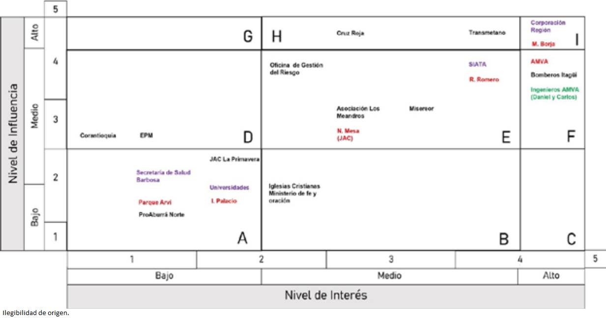 Con relación a los liderazgos femeninos y de acuerdo con la Figura 3, la comunidad percibe bajos niveles de interés en la GRD por parte de los actores involucrados (cuadrantes A, D y G), de los cuales dos son comunitarios -JAC y lideresa Ingrid Palacio-. En el nivel medio de interés (B, E y H), hay cuatro actores comunitarios, dos de ellos lideresas (Nury Mesa y Raquel Romero); mientras que en el nivel alto (C, F, I) entre los cinco actores identificados, no hay ninguna mujer, contrario a la alta valoración que obtuvo Martín Berrío, el único líder masculino reconocido del sector.