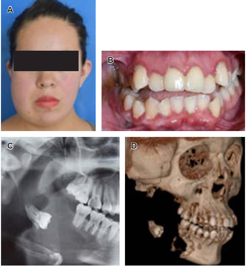 Figura 1 Clínica e imagenología inicial. A) Fotografía fron- tal inicial con aumento de volumen en tercio medio e inferior facial derechos. B) Fotografía en oclusión inicial con lesión traumática en mucosa yugal. C) Ortopantomografía inicial con tercer molar asociado a lesión radiolúcida, con presencia de con presencia de rizoclasia de órganos dentales 46 y 47. D) Reconstrucción tomográfica en 3D, con pérdida ósea de cuello condilar, proceso coronoides, rama, ángulo y cuerpo mandibular derechos.