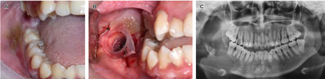 Figura 2 Biopsia incisional. A) Fotografía inicial para colocación de tutor. B) Fotografía con el tutor fijo a mucosa oral. C) Ortopantomografía de control postquirúrgica.