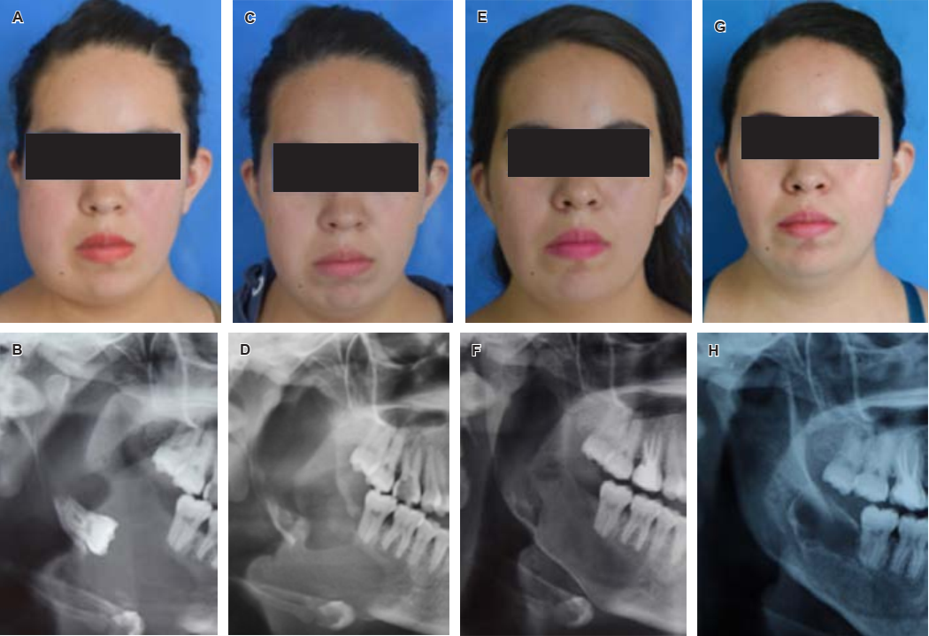 Figura 3 Controles clínicos y radiográficos de dos años de evolución. A) Fotografía frontal inicial con aumento de volumen en tercio medio e inferior facial derecho. B) Ortopantomografía inicial con órgano dental asociado. C) Fotografía frontal un mes posterior a la colocación del tutor. D) Ortopantomografía un mes posterior a la colocación del tutor. E) Fotografía frontal siete meses después de la colocación del tutor. F) Ortopantomografía siete meses después de la colocación del tutor, se aprecia remodelación ósea en región del cuello condilar, rama y cuerpo mandibular derecho. G) Fotografía frontal dos años después de la colocación del tutor. H) Ortopantomografía dos años después a la colocación del tutor, se observa remodelación total de la rama mandibular.
